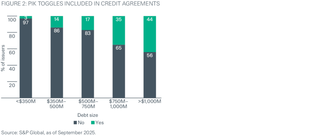 Importantly, these provisions are not applied uniformly across the market (Figure 2). PIK optionality remains primarily concentrated among larger, more established issuers and is generally not available to smaller or more highly leveraged borrowers. In those instances, lenders tend to maintain tighter structural protections and stronger cash-pay requirements. In many cases, borrowers seeking this level of flexibility have traditionally accessed the broadly syndicated loan or high-yield bond markets, where documentation standards are typically more permissive than in direct lending. As competition for larger transactions has increased, private managers have at times needed to align certain terms, such as covenants, with those available in public markets. In addition, they also offer targeted flexibility, for instance in the form of a PIK toggle, to remain competitive and justify the higher spreads asked by private lenders.