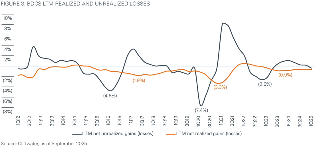 Historical experience also suggests that valuation practices in direct lending have generally been conservative: During periods of financial stress, cumulative markdowns have typically exceeded realized losses by approximately 1.7–2.5x, indicating a prudent approach to credit risk (Figure 3). While some degree of subjectivity is inherent in any illiquid asset class, material discrepancies appear to be uncommon and are usually concentrated in distressed or highly idiosyncratic situations.