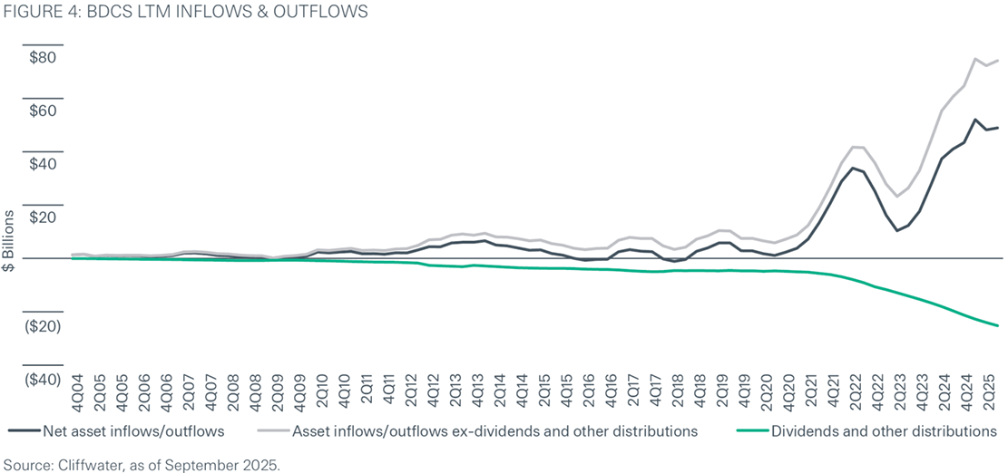 Media coverage has increasingly focused on elevated redemption activity in certain BDCs in recent quarters, often presenting these outflows as a sign of stress. But this view captures only part of the picture. While redemption requests have increased in some vehicles, most BDCs continue to report positive net flows overall, supported by ongoing investor demand and new subscriptions.